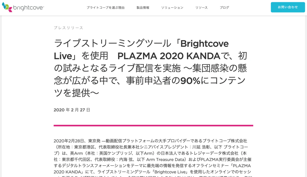 2020年2月に開催された「PLAZMA 2020 KANDA」では、感染拡大が懸念されることから、リアルのみの開催からオンラインでの同時配信に変更するという判断が、開催前日に下されました。急な変更にも関わらずライブストリーミングツール「Brightcove Live」を使用することで、高品質で安定したライブ配信を実現。さらにオンライン同時配信にすることで、事前申込みの90%および想定来場者の200%を超える方へコンテンツを届けることができました。