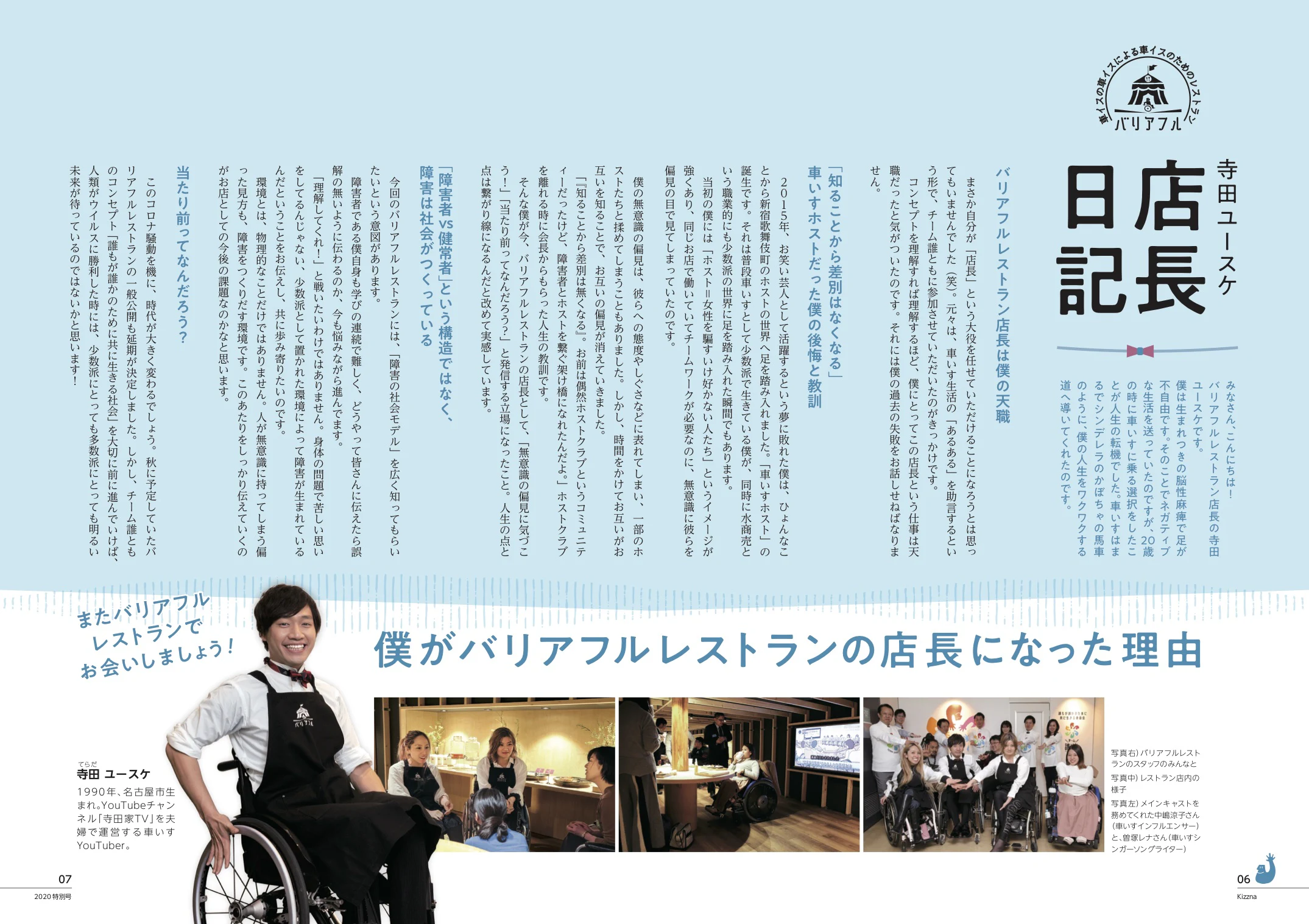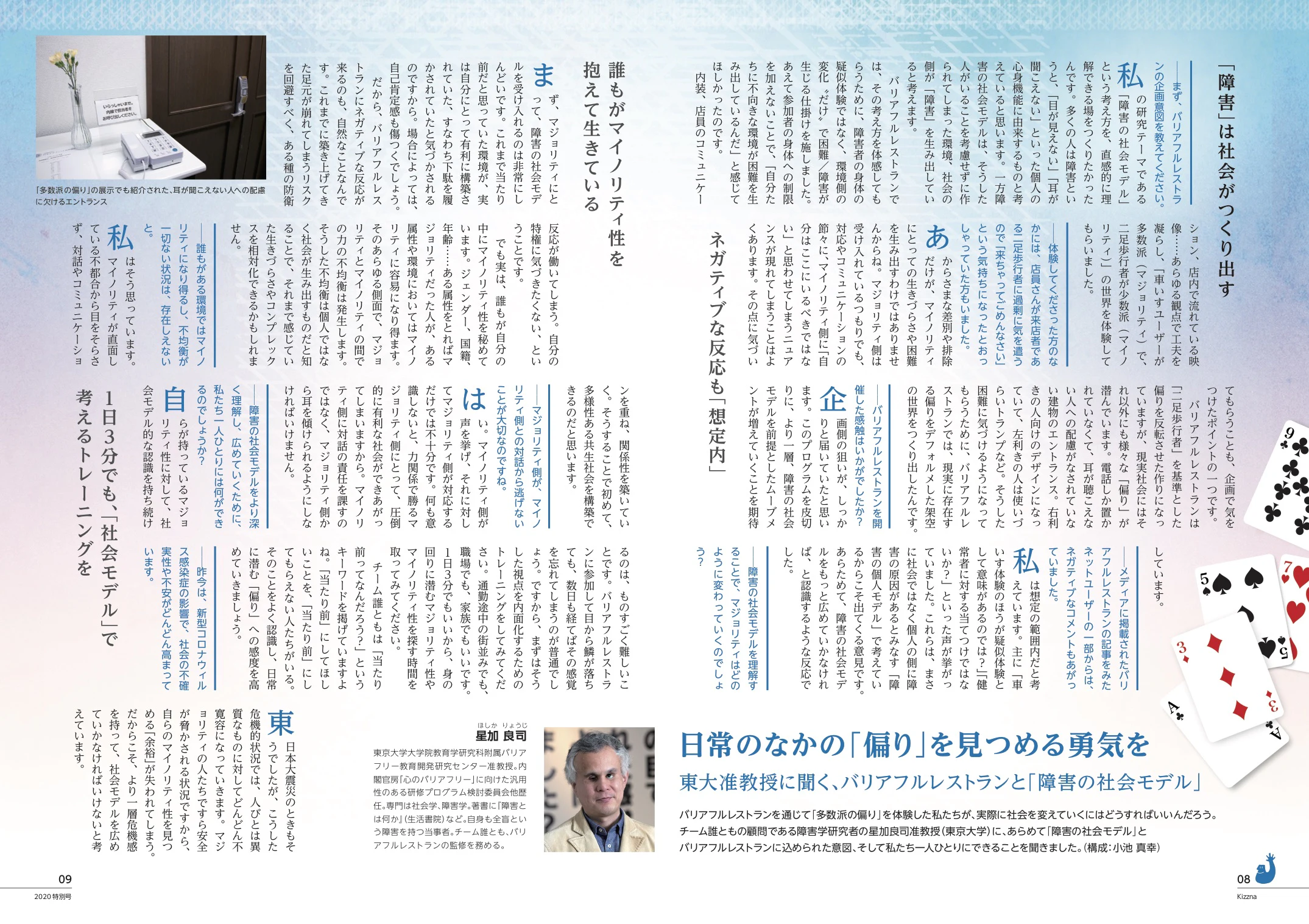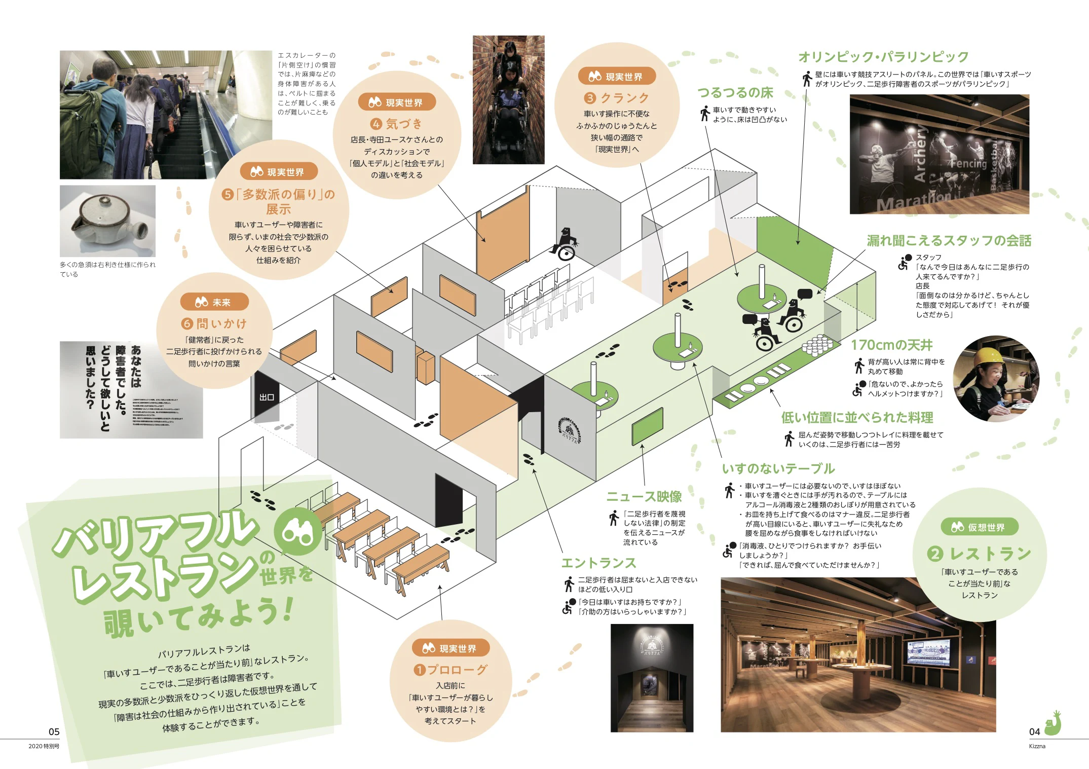 またイベントを追体験し、気づきを深めるための冊子も制作。日本ケアフィット共育機構が定期刊行しているフリーペーパー『紲 Kizzna』バリアフルレストラン特別号では、レポート記事や図解ページを設けることで、バリアフルレストランに参加していない人もイベントを追体験し、「障害の社会モデル」の理解が深められる冊子を制作しました。