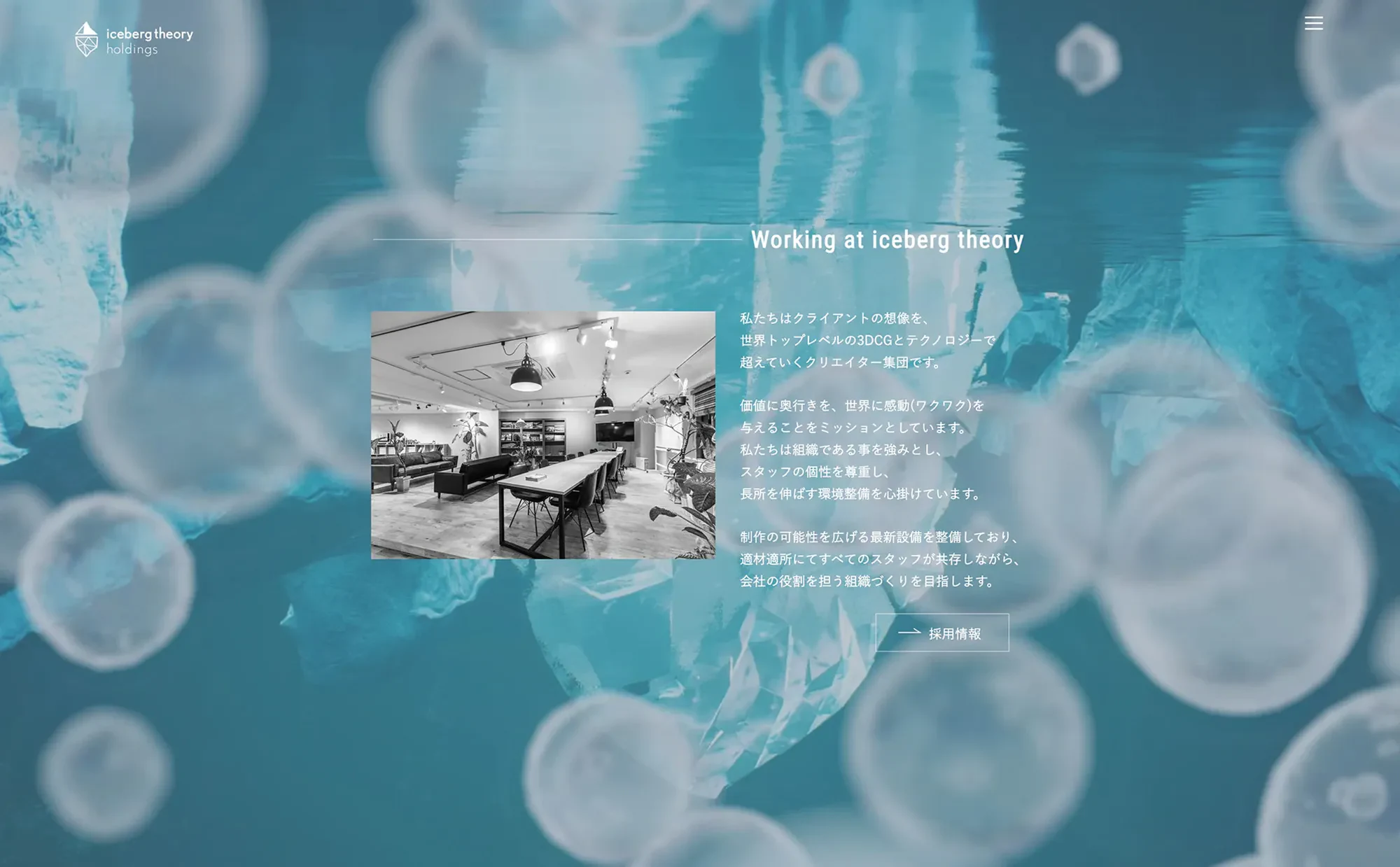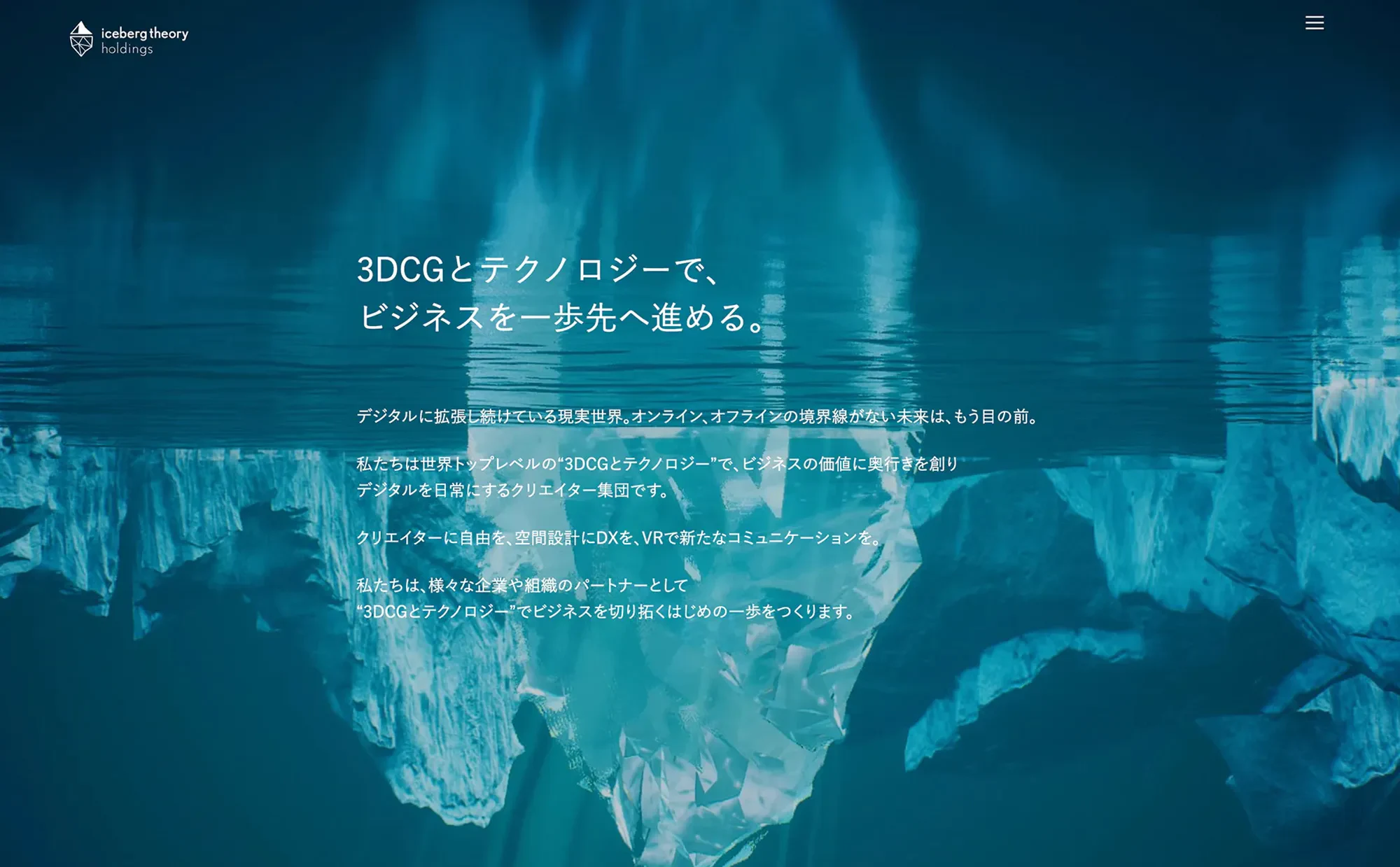 iceberg theory holdingsは、3DCGを駆使した建築ビジュアライゼーション事業に始まり、デジタル広告やインダストリアルCG制作、バーチャルプラットフォームサービスなど、時代のニーズを捉え、広く3DCGとテクノロジーを融合したデジタルイノベーション事業を牽引する企業です。前身のスペースラボ株式会社の事業拡大に伴い、2021年12月に持株会社を設立、現在子会社4社を傘下に持つホールディングスカンパニーへと躍進をし続けています。