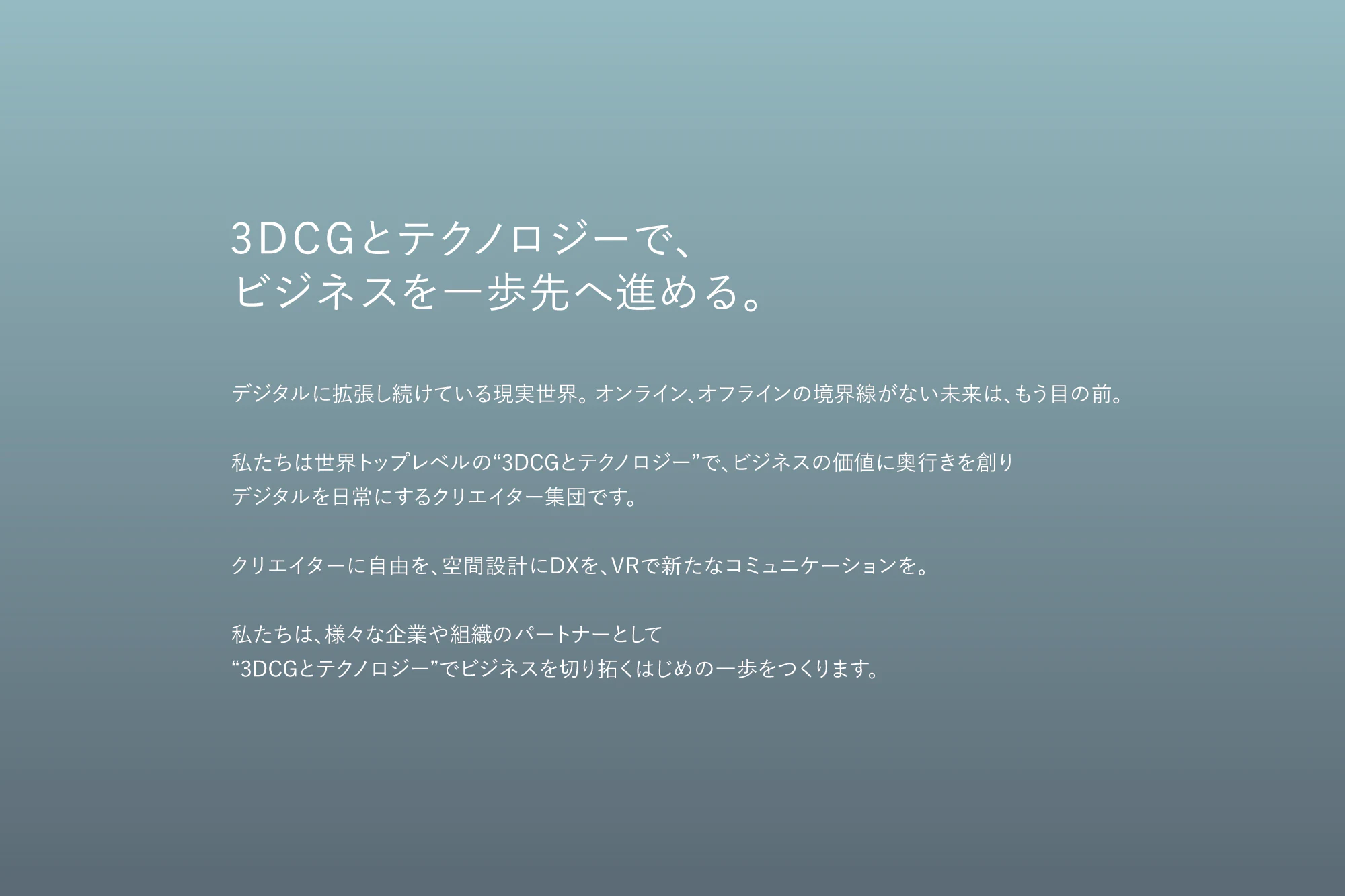 また、新会社のコーポレートWebサイトの制作、3DCGアニメーションの制作ディレクションを行いました。企業のケイパビリティを伝えるために、同社の3DCGクリエイターと共に、何枚ものコンテやイメージを交わしながら、ストーリー構成やCG表現の細部にこだわって制作しました。