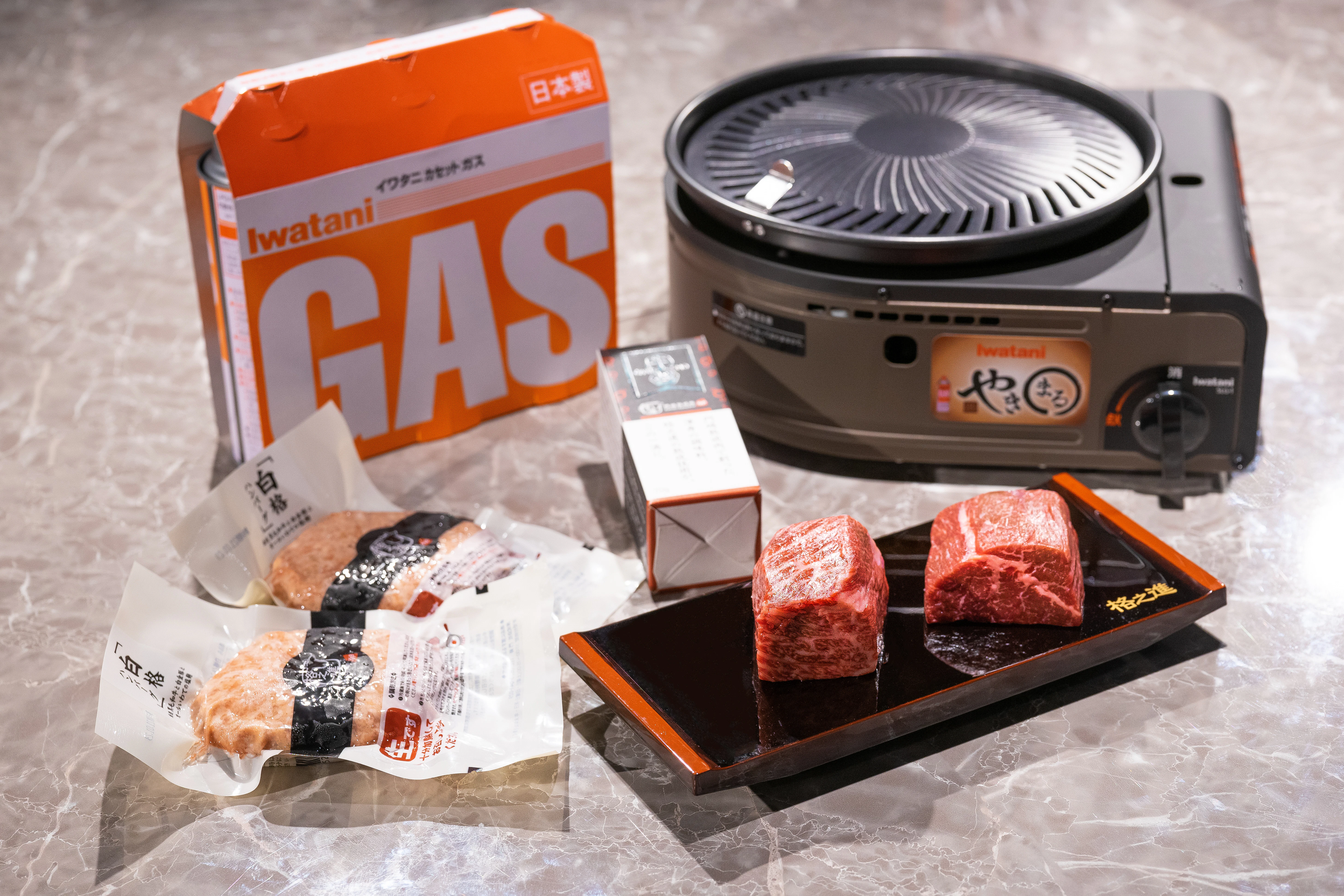 記者の手元に事前に届けられたカセットコンロと焼肉セット。